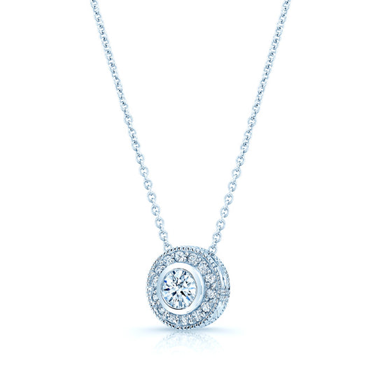 Diamond Round Bezel Halo Pendant With Milgrain In 18k White Gold