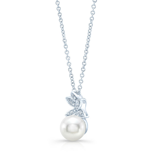 Fresh Water Pearl And Diamond Butterfly Pendant In 14k White Gold