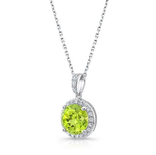Peridot And Diamond Circle Halo Pendant In 14k White Gold With 18 Inch Baby Curb Chain