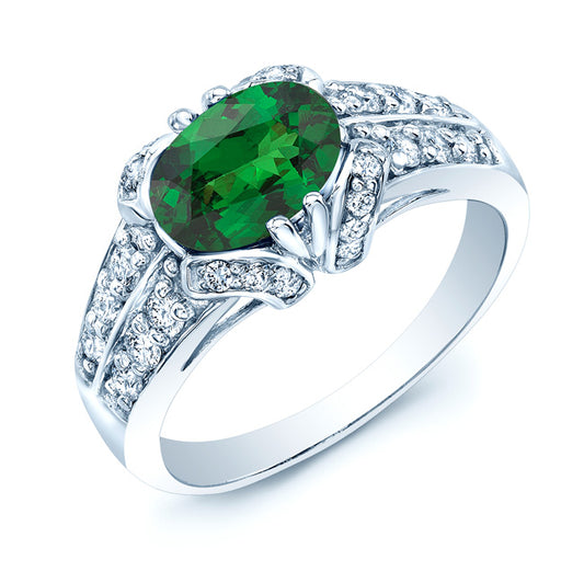 Tsavorite And Diamond Sideway Oval Double Row Shank Ring In 14k White Gold