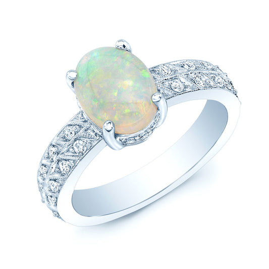 Opal And Diamond Oval Ring In 18k White Gold (3/8ctw)