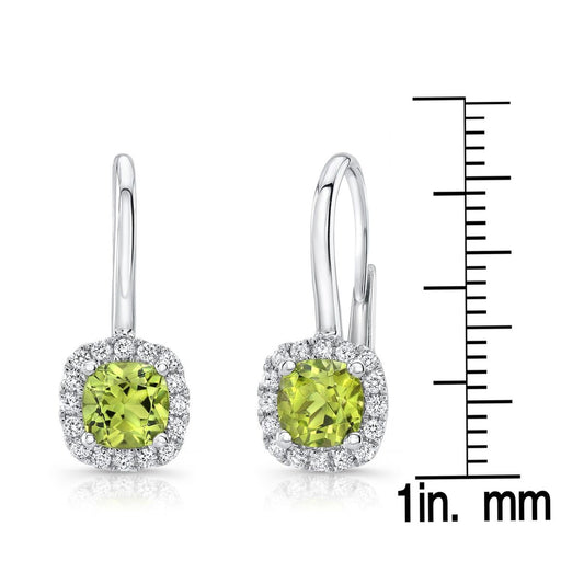 Peridot And Diamond Square Halo Lever Back Earrings In 14k White Gold