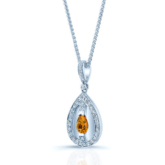 Citrine And Diamond Teardrop Dangle Pendant In 14k White Gold ( 17-in Wheat Chain)