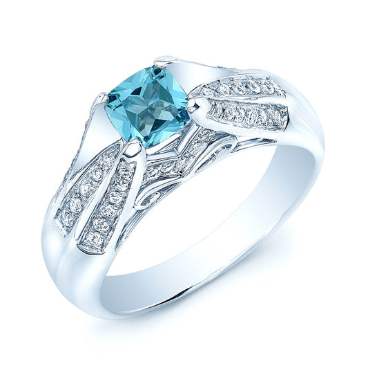 Aquamarine And Diamond Three Row Cushion Center Ring In 18k White Gold