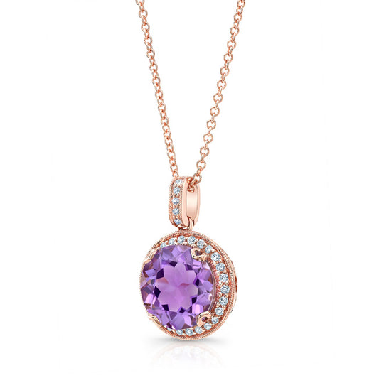 Amethyst And Diamond Round Halo Antique Finish Pendant In 14k Rose Gold ( Hi / Si )