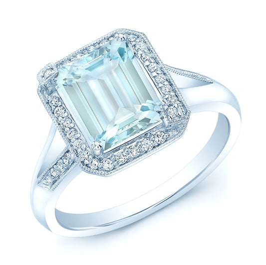 Aqua And Diamond Emerald Cut Halo And Accented Corners Ring In 14k White Gold (hi / Si)