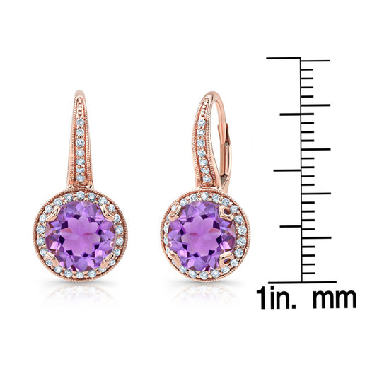 Amethyst And Diamond Round Halo Antique Finish Dangle Earrings In 14k Rose Gold ( Hi / Si )