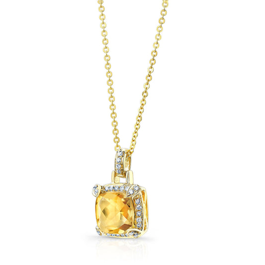 Citrine Cushion And Pave Diamond Pendant In 14k Yellow Gold (9mm)