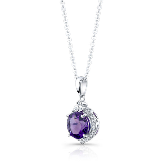 Amethyst And Diamond Round Halo Pendant With Bezel Accent In 14k White Gold