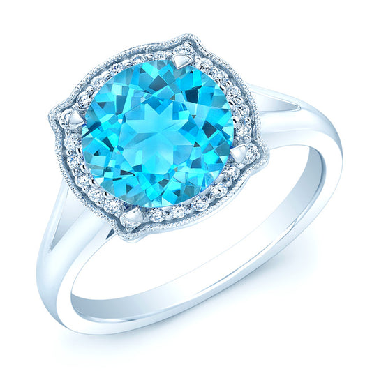 Blue Topaz And Diamond Round Halo Pinched Corner Ring In 14k White Gold
