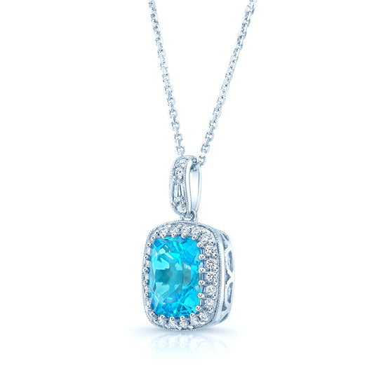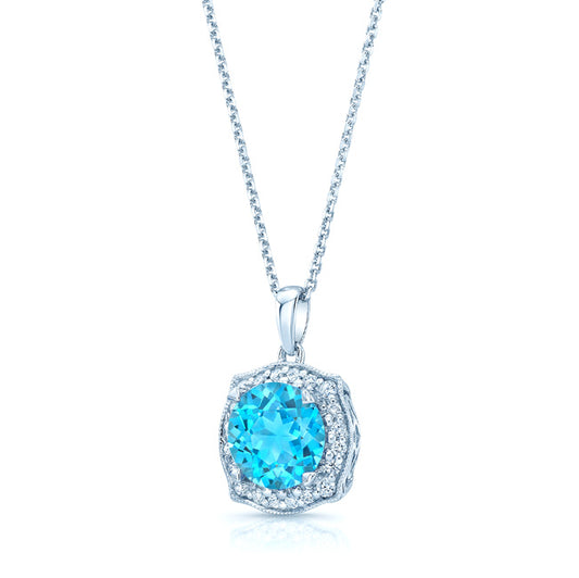 Blue Topaz And Diamond Round Halo Pinched Corner Pendant In 14k White Gold ( Hi / Si )