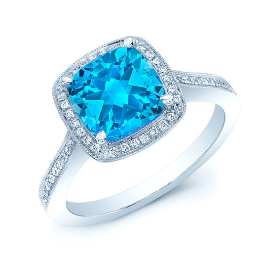 Swiss Blue Topaz Cushion And Diamond Halo Ring In 14k White Gold (1/5 Ct. Tw.)