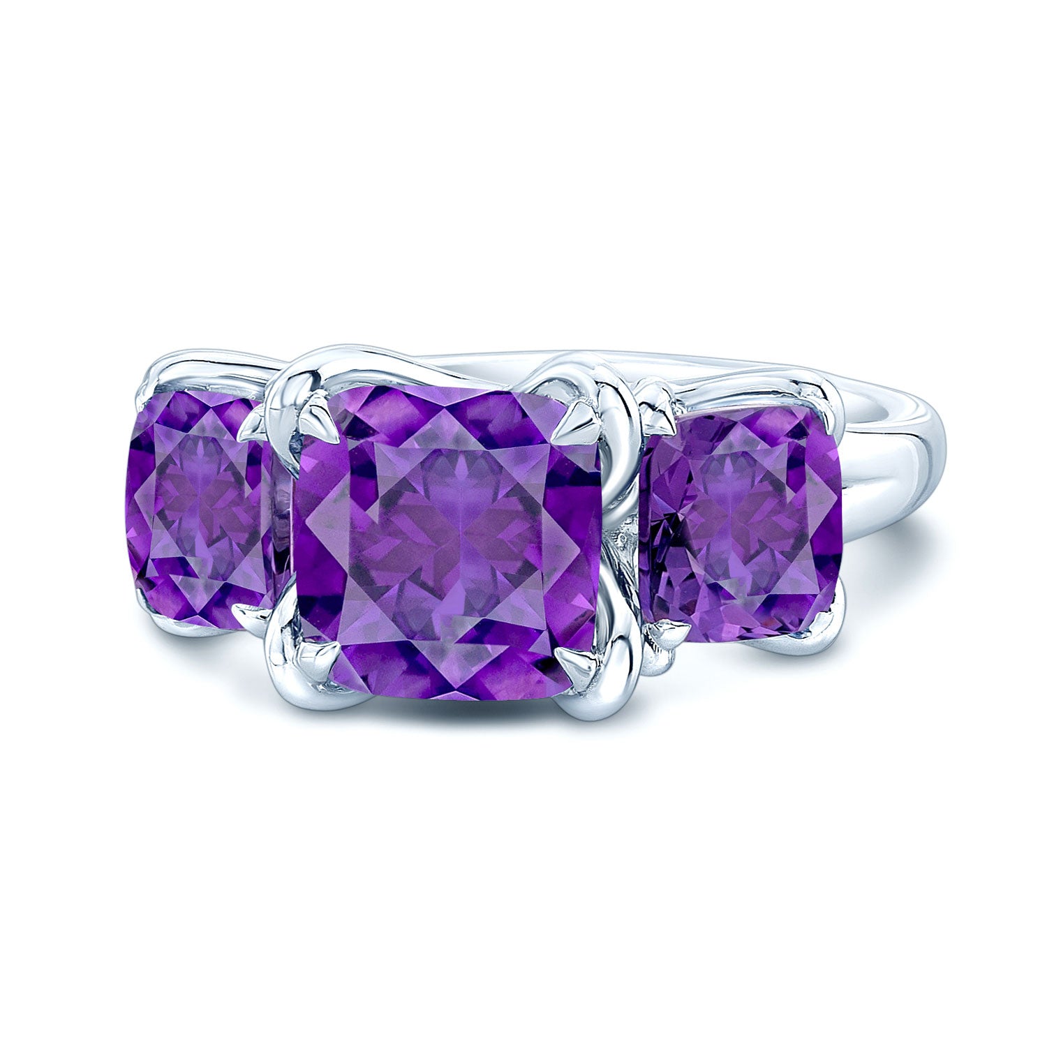 14k White Gold 3-stone Amethyst Ring With 1 Cushion Cut 8mm And 2 Cushion Cut 6mm Amethyst