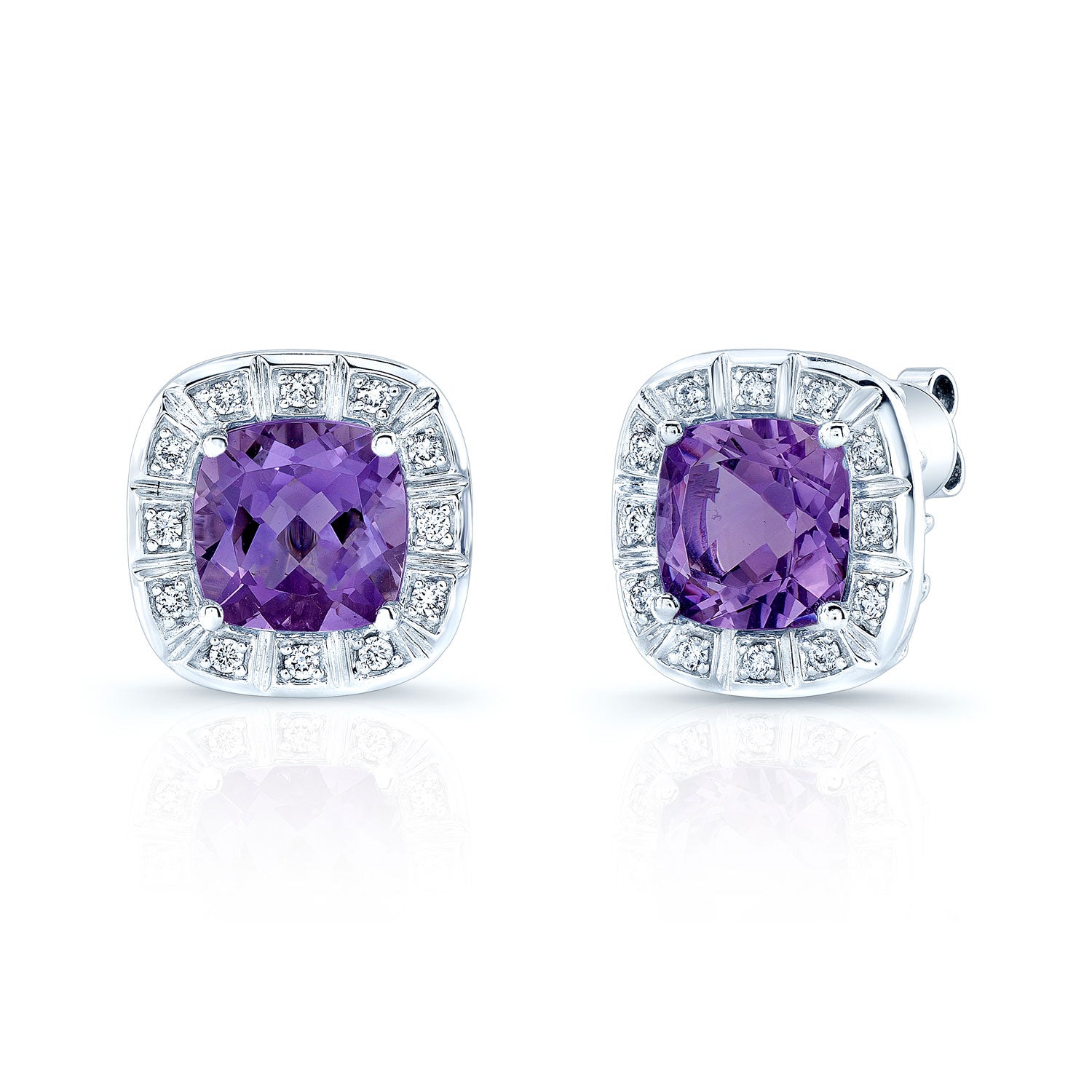 14k White Gold Earrings With 2 Cushion Cut 8mm Amethysts=3.85ctw And 24 Round Brilliant Diamonds=0.25 Ctw