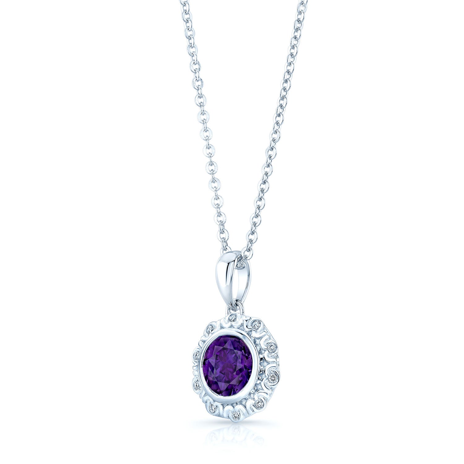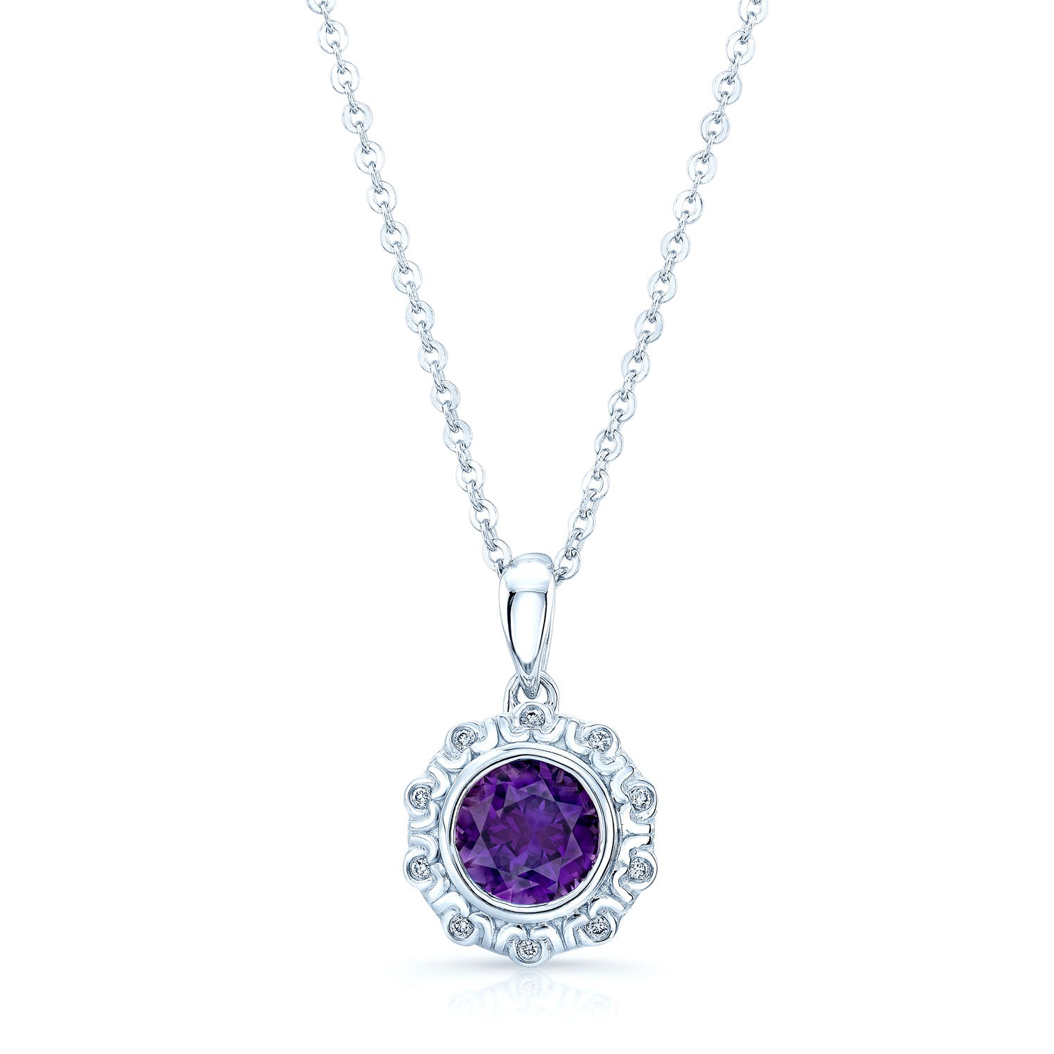 14k White Gold Pendant With 1 6.50mm Round Amethyst And 10 Brilliant Round Diamonds=0.03 Carat Total Weight On A 17 Inch Rolo Chain