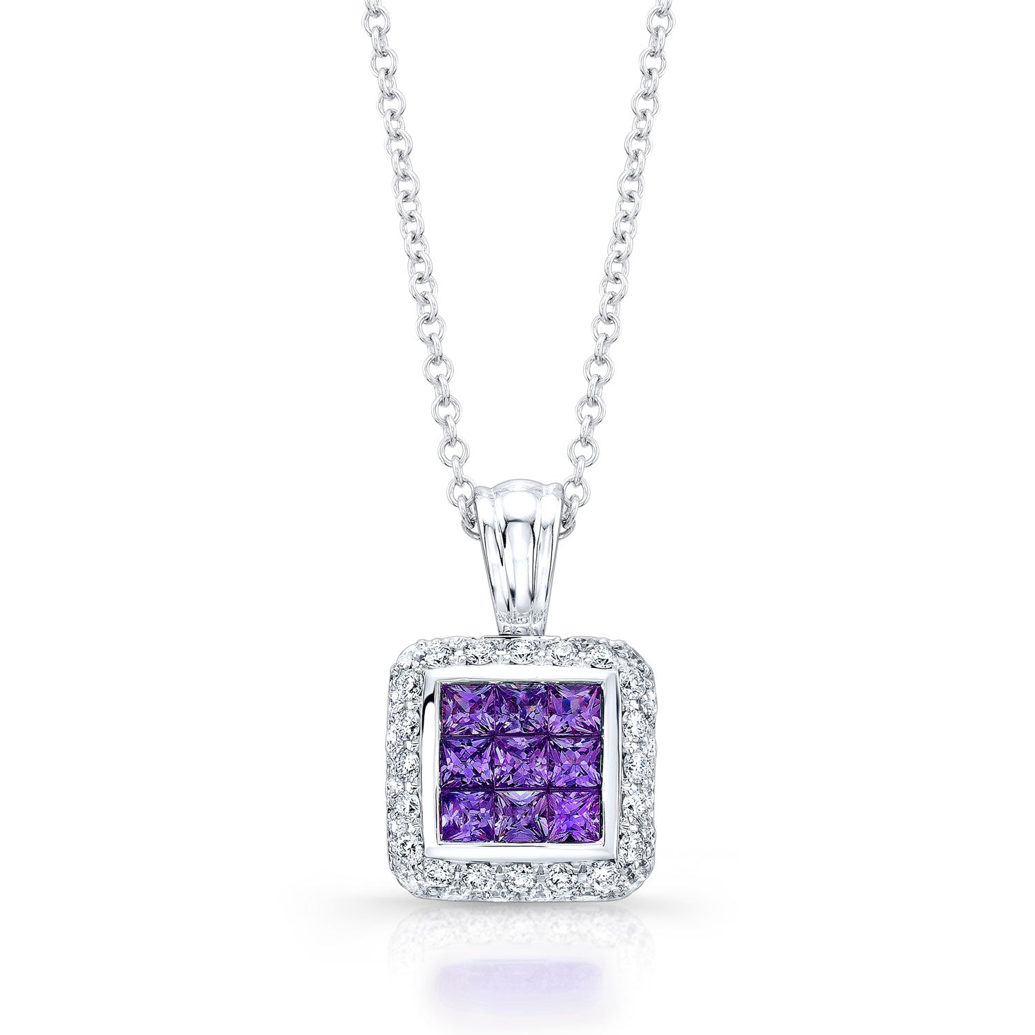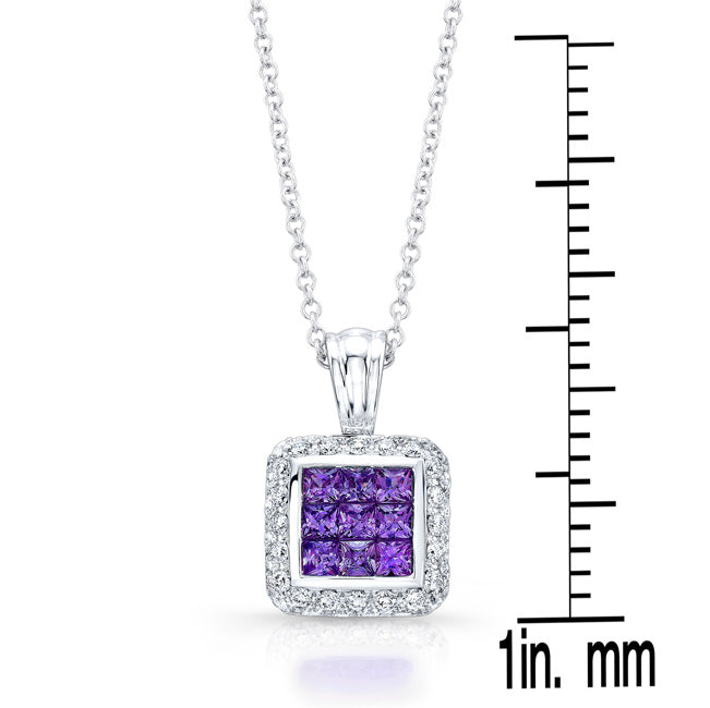 14k White Gold Pendant With 9 2.50mm Princess Cut Amethysts And 38 Brilliant Cut Diamonds 1/2 Ctw On A 17" Inch Rolo Chain