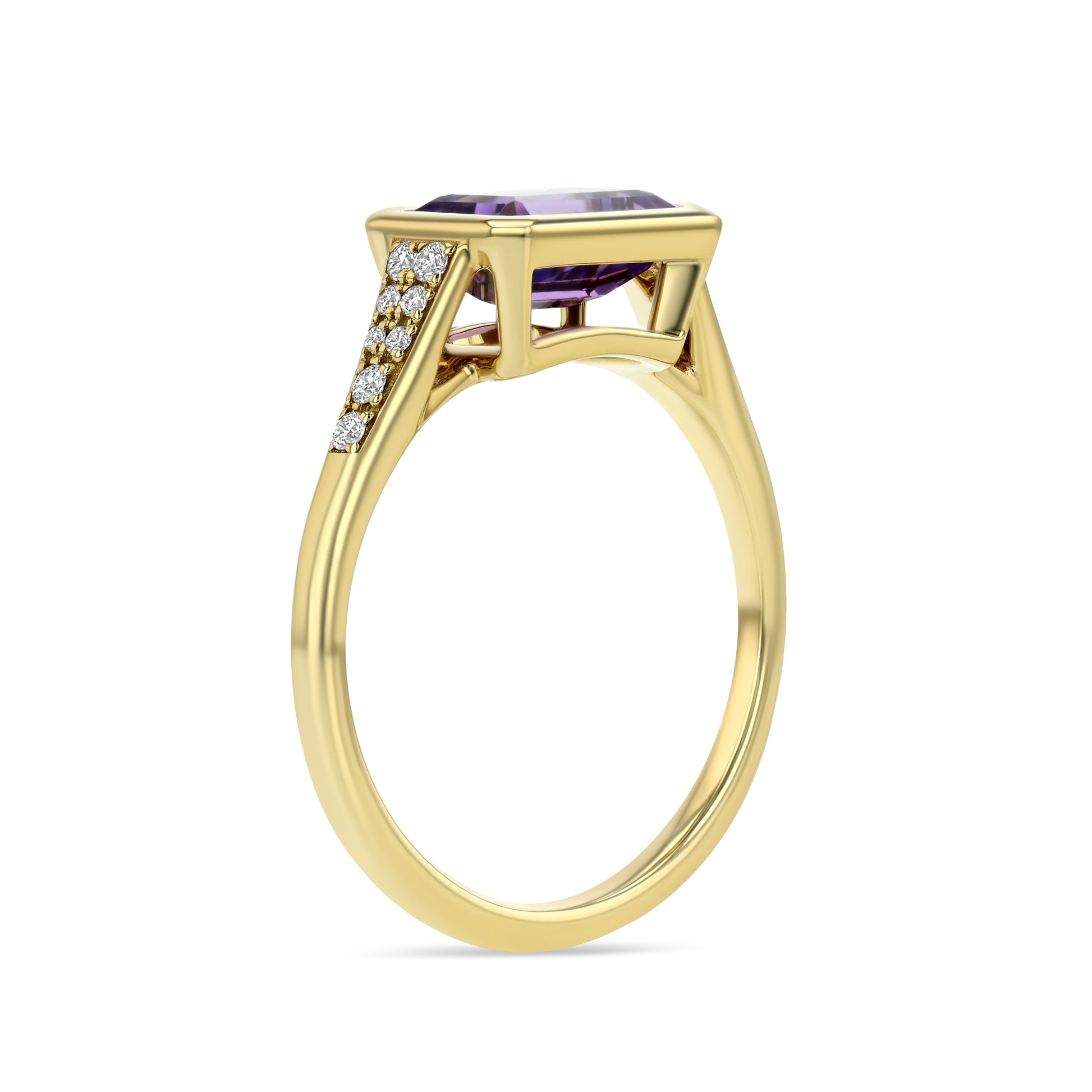 14 karat yellow gold east-west emerald cut bezel ring with 8x6mm amethyst and 1/10 carats round diamonds