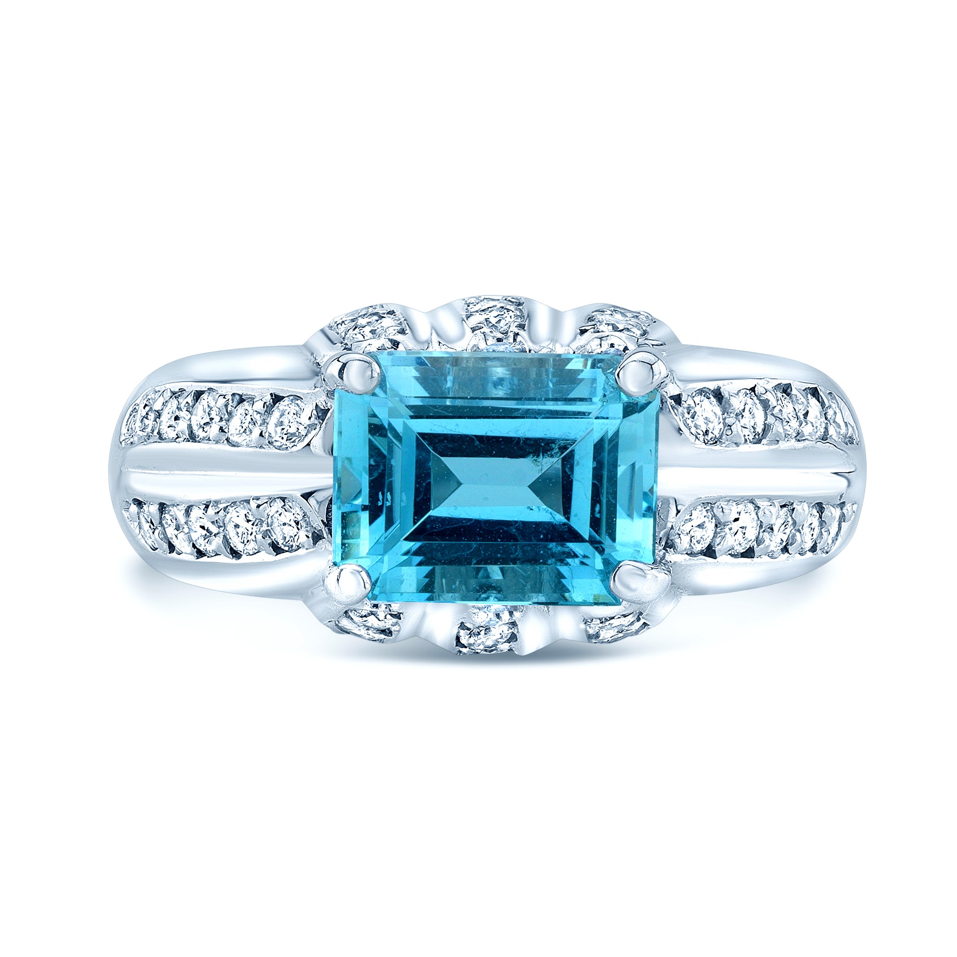 18 Karat White Gold Ring With 1 Emerald Cut Aquamarine 9x7mm And 32 Round Brilliant Diamonds 0.45 Ctw Ring Size 6.5