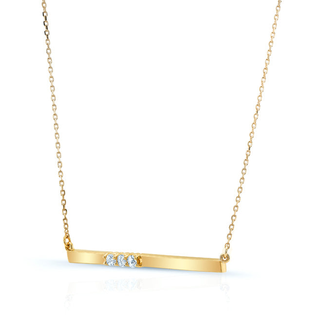 14k Yellow Gold Bar Necklace With 3 Round Brilliant Diamonds Weighing 0.15 Carat On A 17.5 Inch Chain