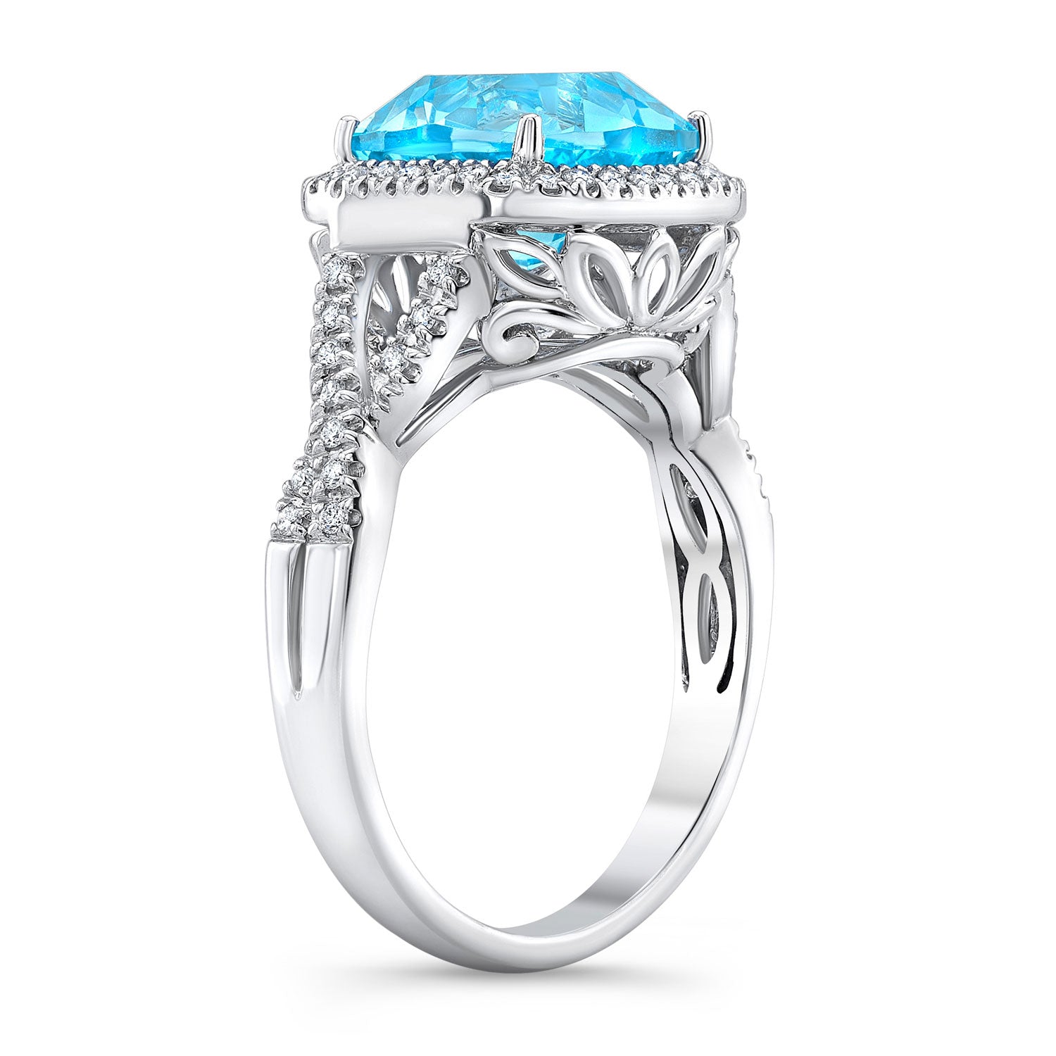 14k White Gold Ring With 9mm Cushion Blue Topaz And 54 Round Brilliant Diamonds Weighing 1/5ctw (0.18ct Min)