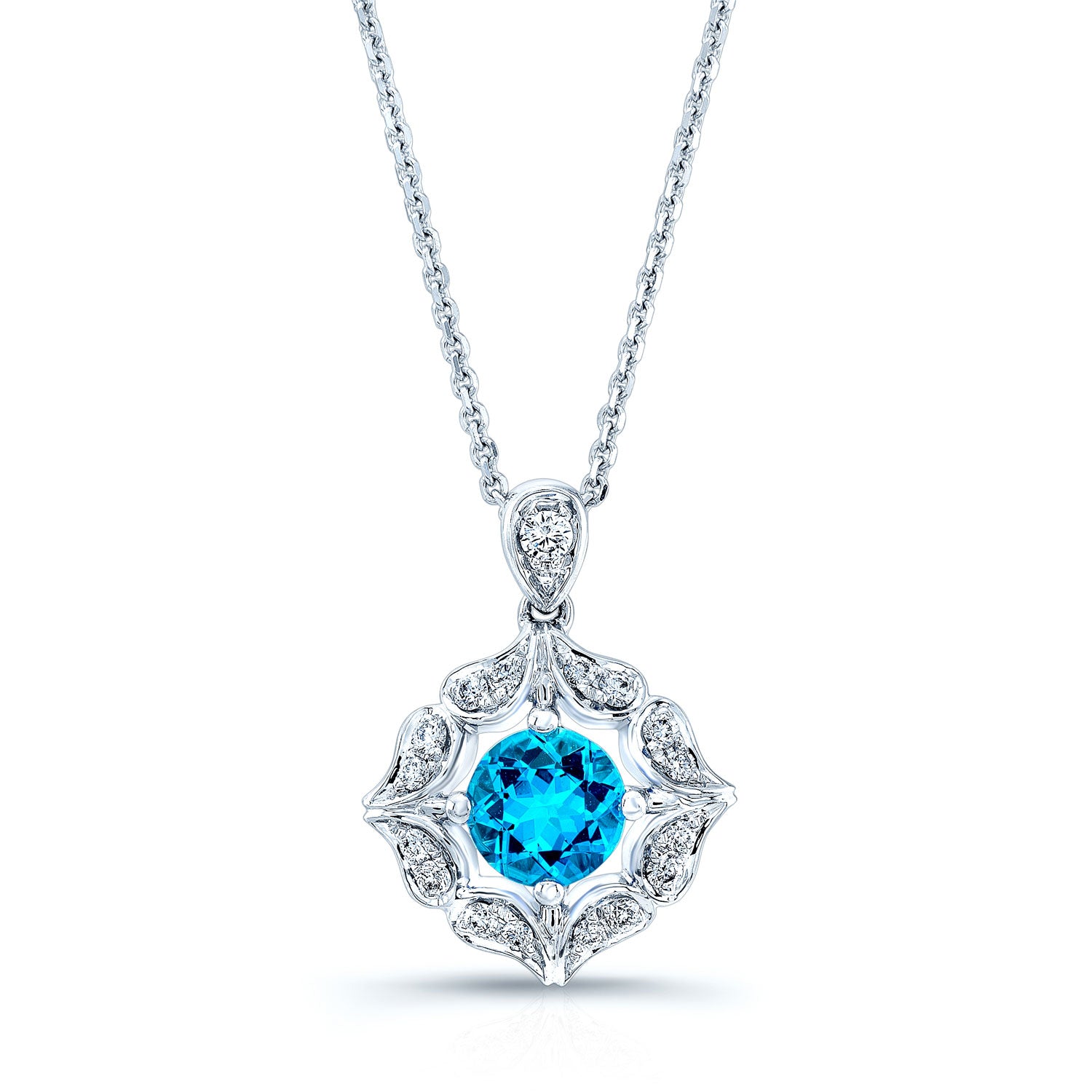 14k White Gold Pendant With 1 Round Blue Topaz 6mm And 17 Round Brilliant Diamonds 0.16 Ctw, 18-in Curb Chain