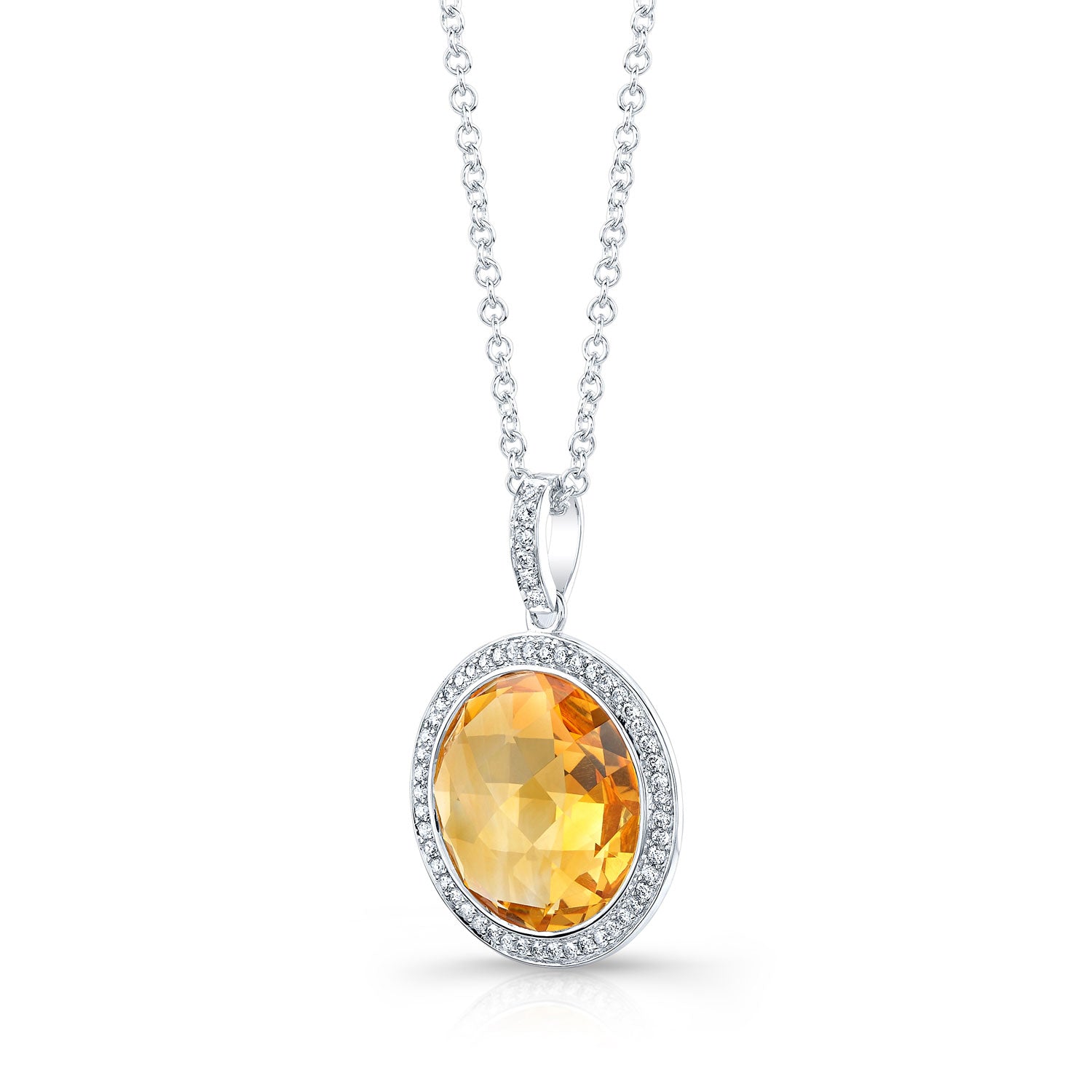 14k White Gold Pendant With 1 Round Checkerboard Citrine Measuring 14mm(7.55ct) And 52 Round Brilliant Diamonds Weighing 0.25 Carats On An 18 Inch Rolo Chain