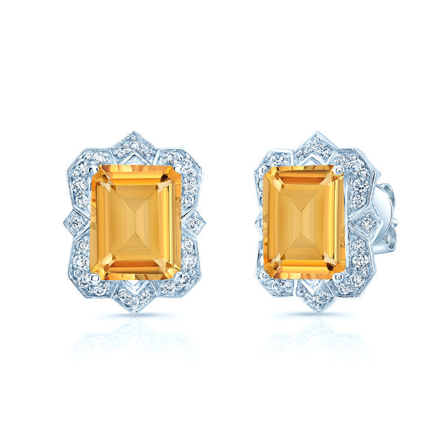 14k White Gold Earrings With 2 8x6mm Emerald Cut Citrines Weighing 3.40ctw And 48 Round Brilliant Diamonds Weighing 1/5ctw