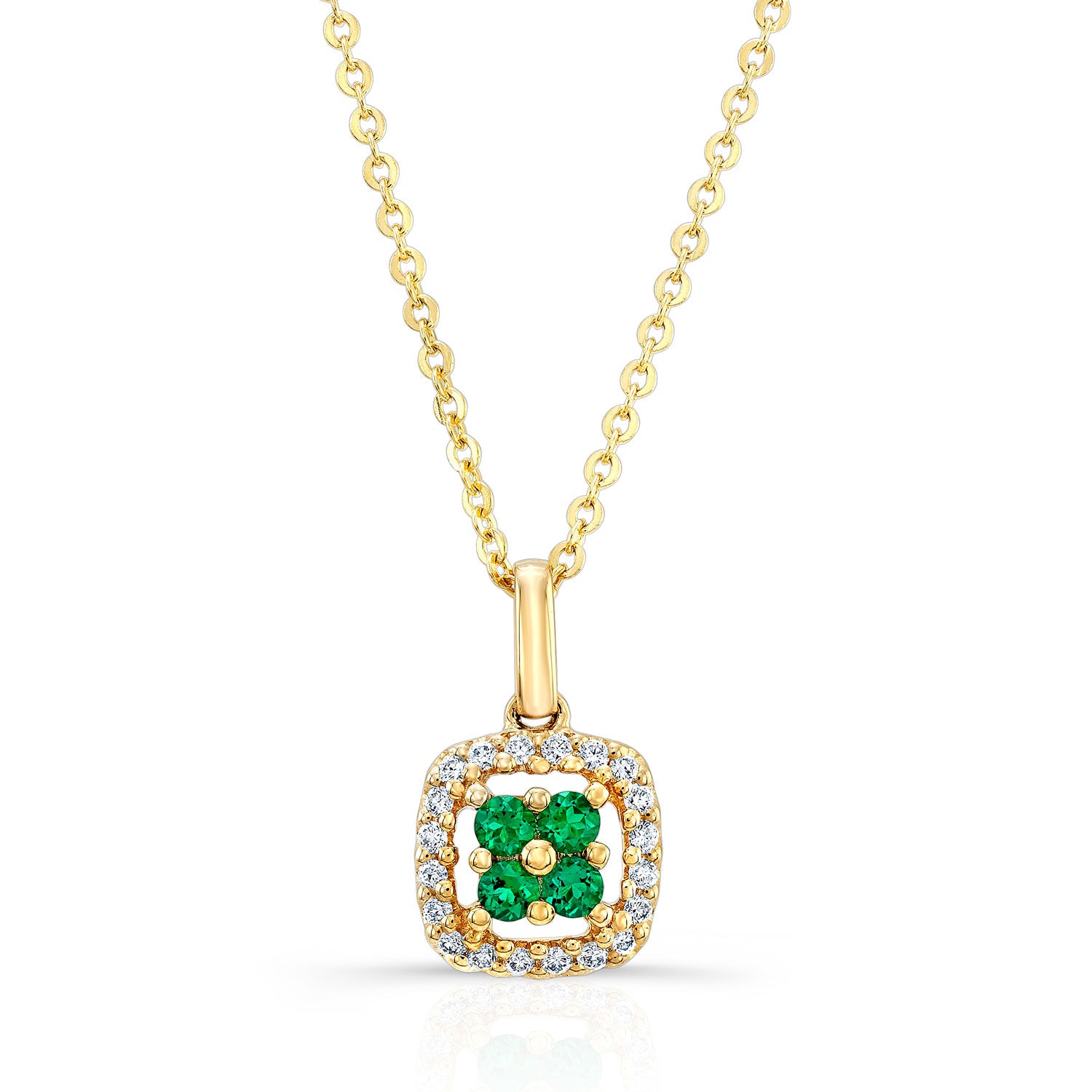 14 Karat Yellow Gold Pendant With 4 Round Created Emerald 2.25mm And 20 Round Brilliant Diamonds 0.12 Ctw With 18 Inch Baby Curb Chain