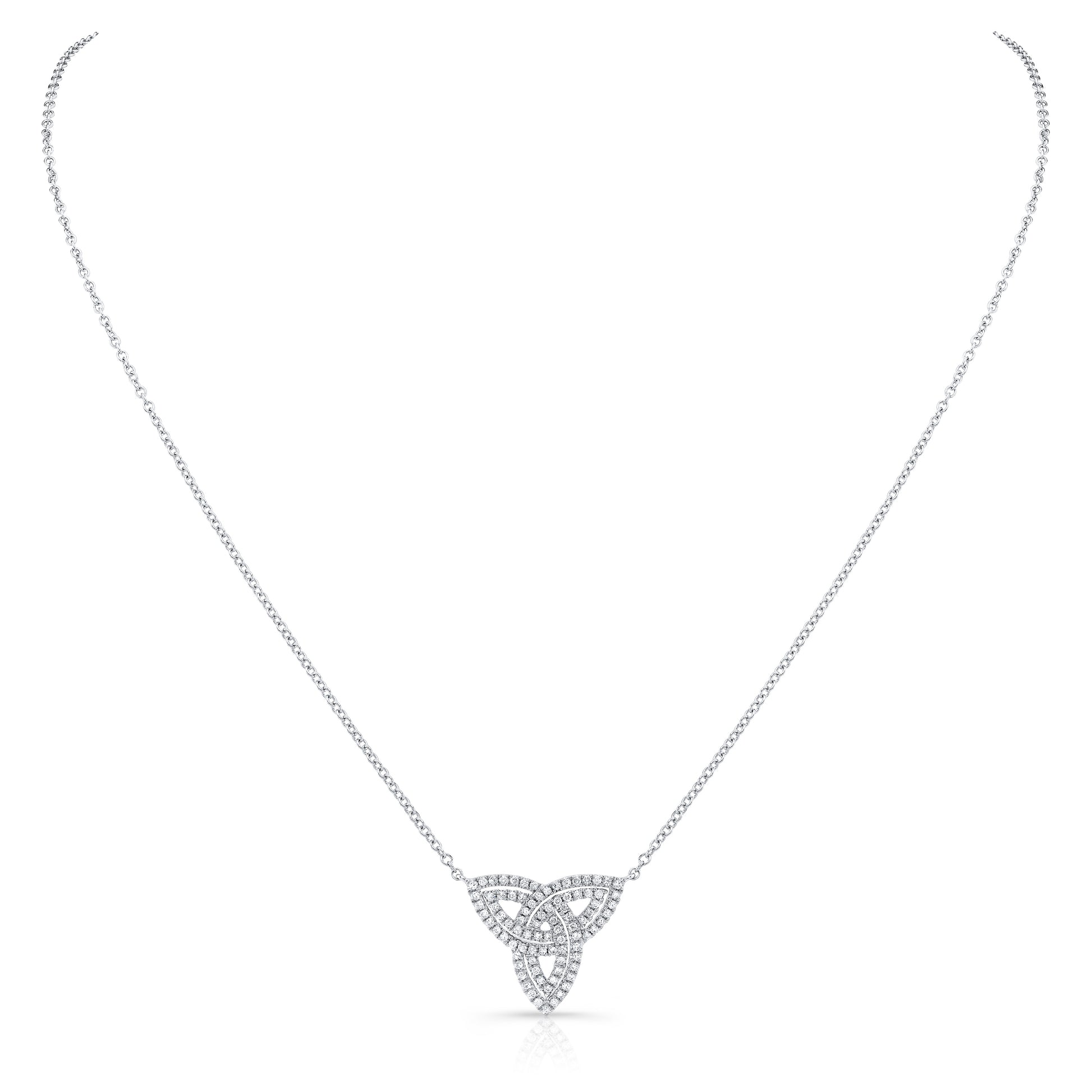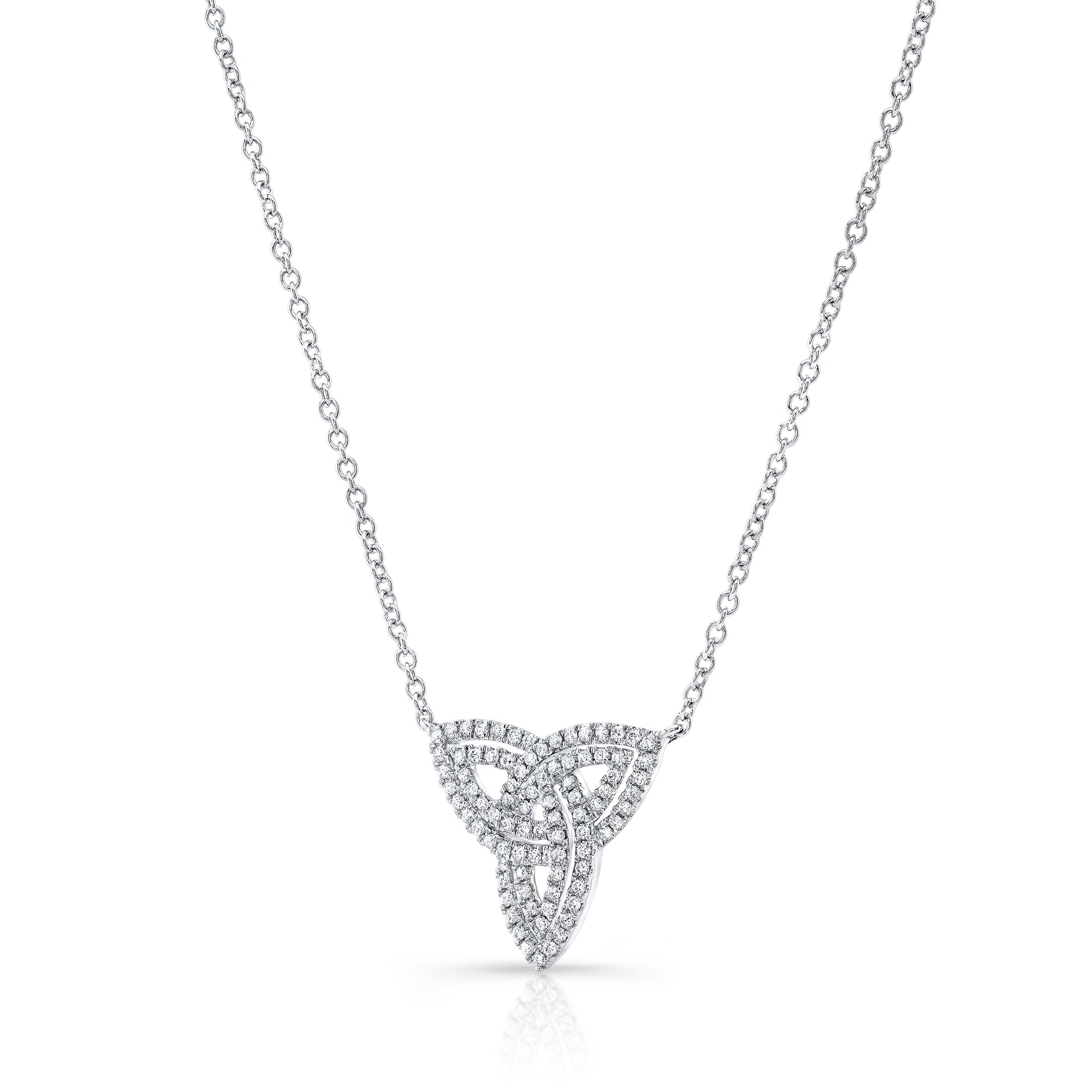 14 karat white gold trinity knot necklace with round brilliant diamonds 3/8ctw, 18 inch length