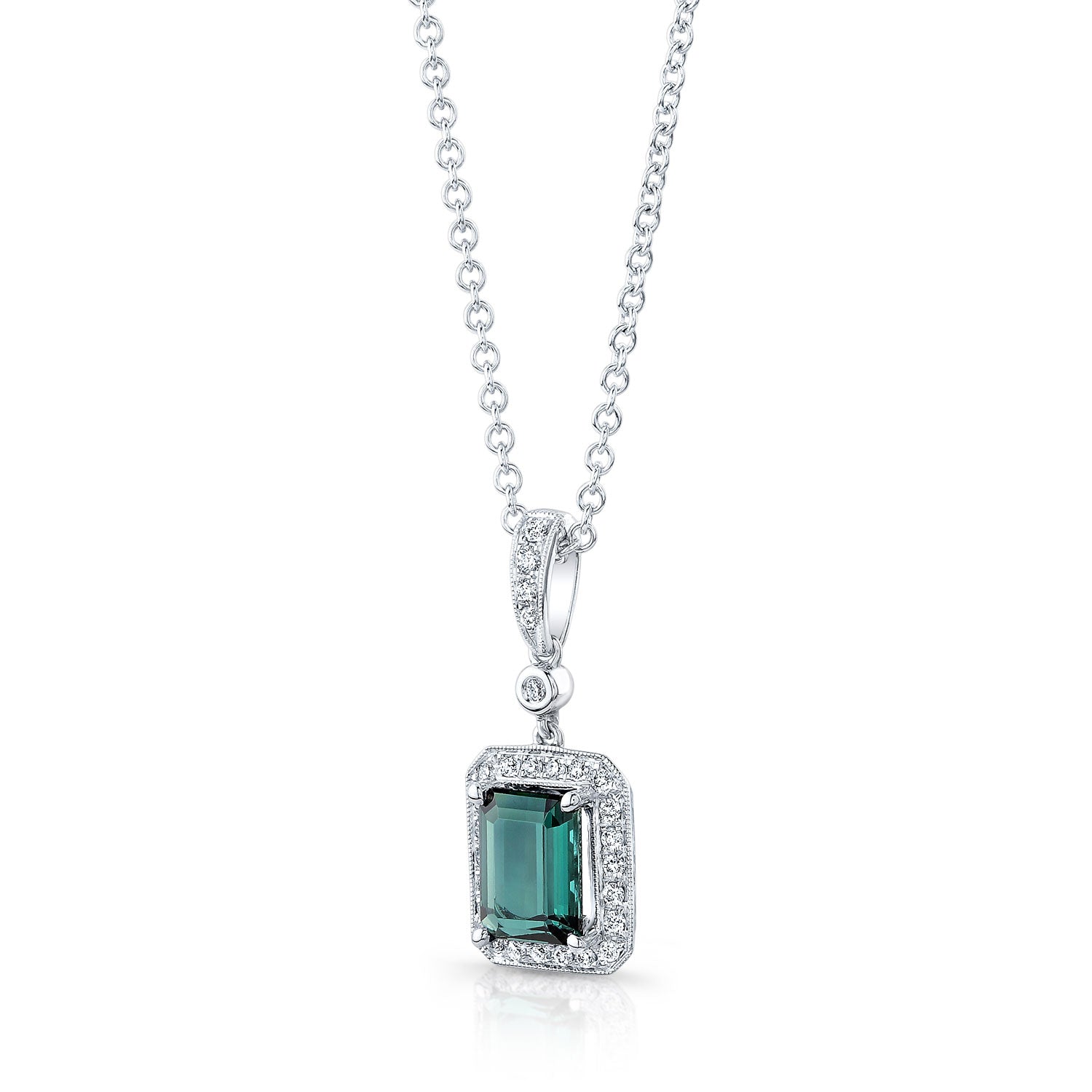 14k White Gold Pendant With 1 Emerald-cut Green Tourmaline Measuring 8x6mm(1.70ct) And 27 Round Brilliant Diamonds Weighing 0.20 Carats On An 18 Inch Rolo Chain
