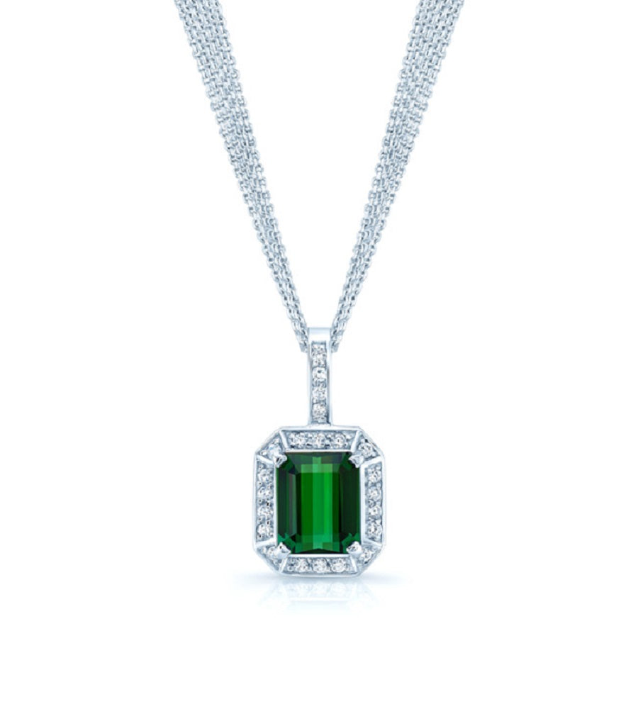 18k White Gold Pendant With 1 Emerald Cut 12x10mm Green Tourmaline Weighing 6.69ctw And 22 Round Brilliant Diamonds Weighing 3/8ctw On A 16 Inch 9 Strand Chain