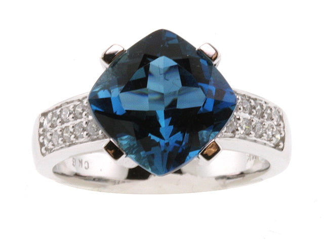 14 Karat White Gold Ring With 1 Cushion Cut London Blue Topaz At 10mm And 36 Round Brilliant Diamonds Weighing 1/4 Carats