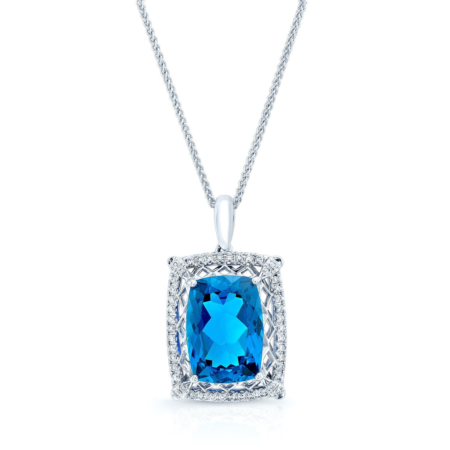 18k White Gold Pendant With 1 Cushion Cut London Blue Topaz At 14x10mm Weighing 9.00ct And 46 Brilliant Cut Diamonds Weighing 0.25ctw Includes 17 Inch Spiga Chain