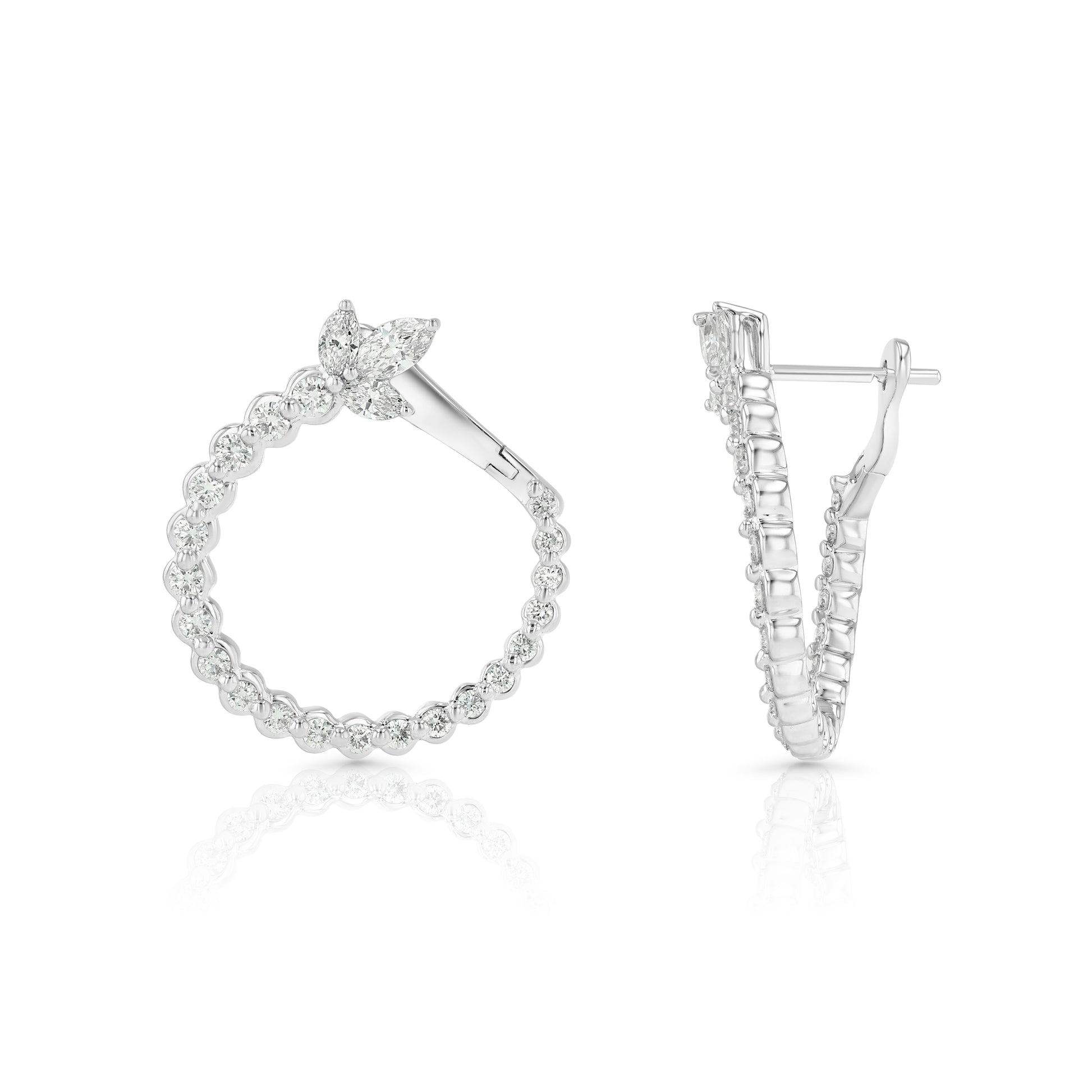 14 karat white gold circle earrings with 6 marquise diamonds 1/2ctw and 42 round brilliant diamonds 4/5ctw. Notched posts with hinged backs.