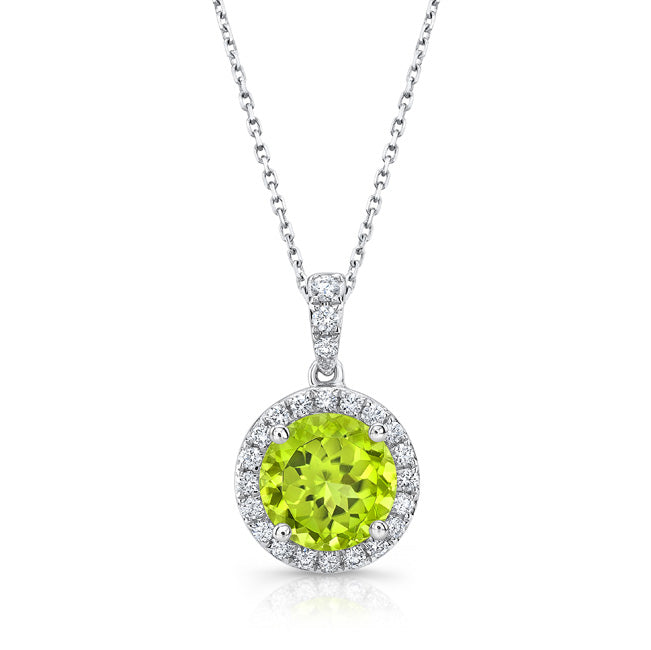 Peridot And Diamond Circle Halo Pendant In 14k White Gold With 18 Inch Baby Curb Chain