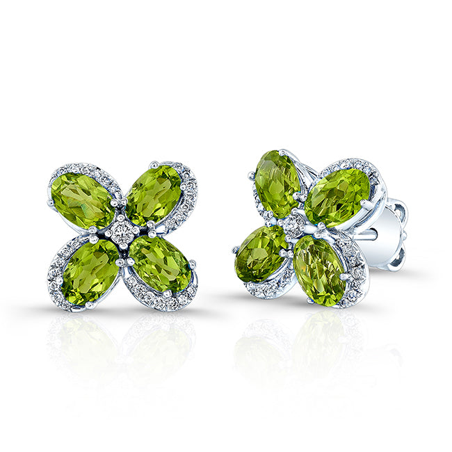14 Karat White Gold Earrings With 8 Oval Cut Peridot At 6x4mm And 58 Round Brilliant Diamonds Weighing 1/5 Ctw