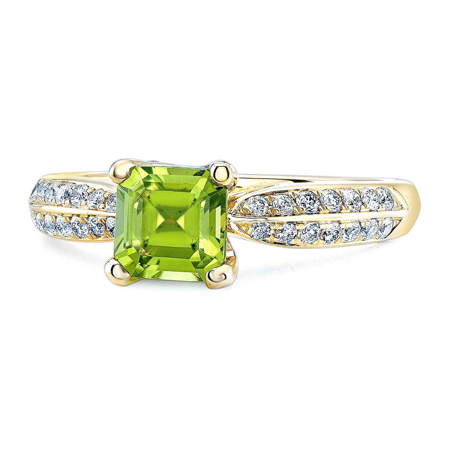 14 Karat Yellow Gold Ring With 1 Octagon Peridot At 6mm And 46 Round Brilliant Diamonds Weighing 0.30 Carats (hi/vs)