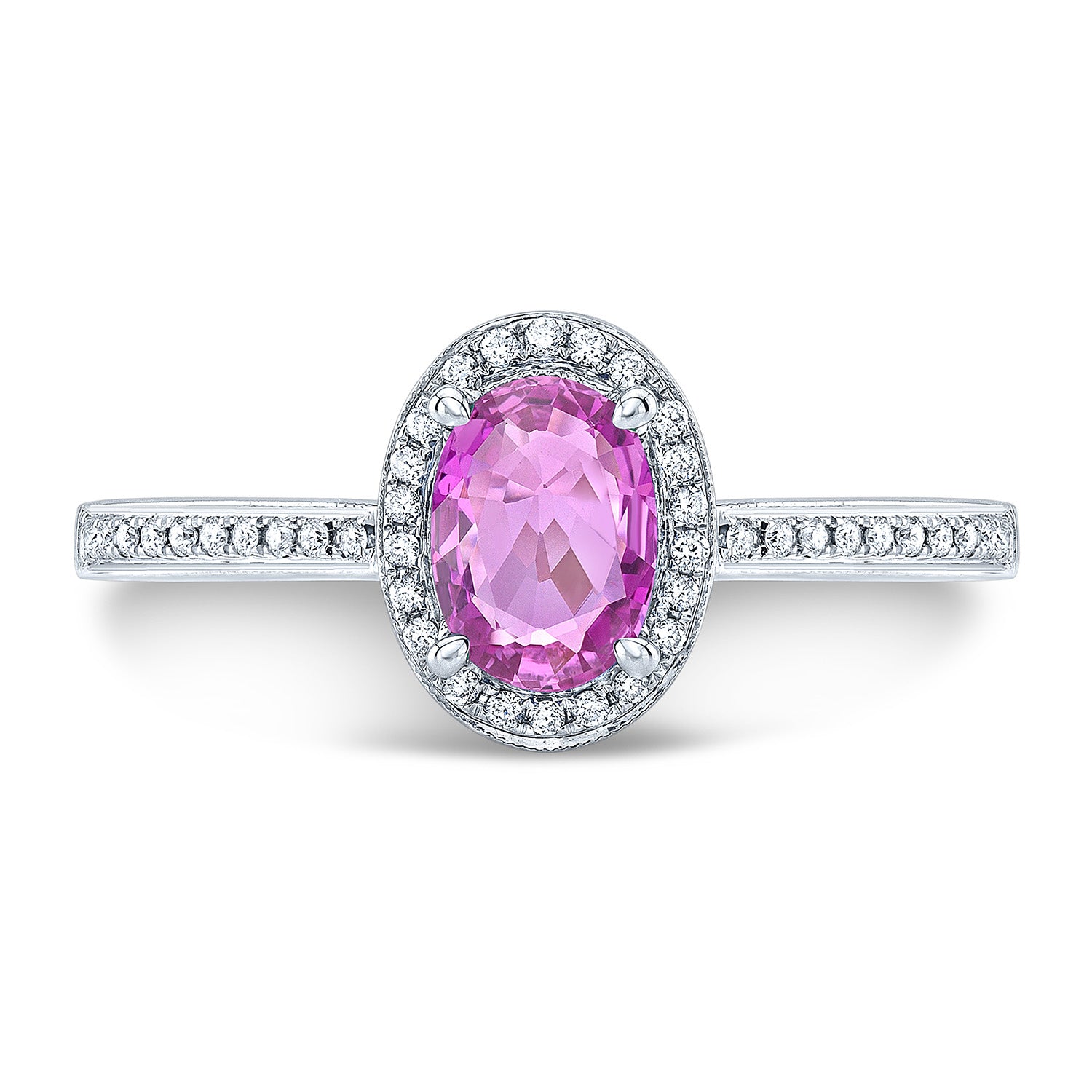 Pink Sapphire And Diamond Oval Halo Ring In 14k White Gold (7x5mm)
