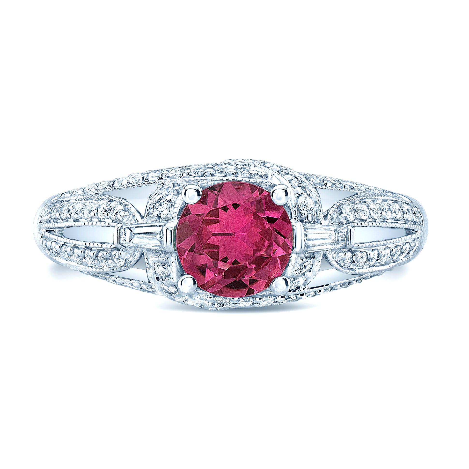 14 Karat White Gold Ring With 5mm Round Brilliant Pink Tourmaline Center, 2 Taper Baguette 0.07ctw And 78 Round Brilliant Diamonds 0.25ctw