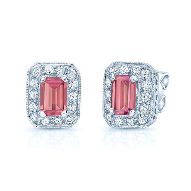 14 Karat White Gold Earrings With 2 Emerald Cut Pink Tourmaline At 6x4mm With 28 Round Brilliant Diamonds Weighing 1/3 Carats (hi/i1-i2)