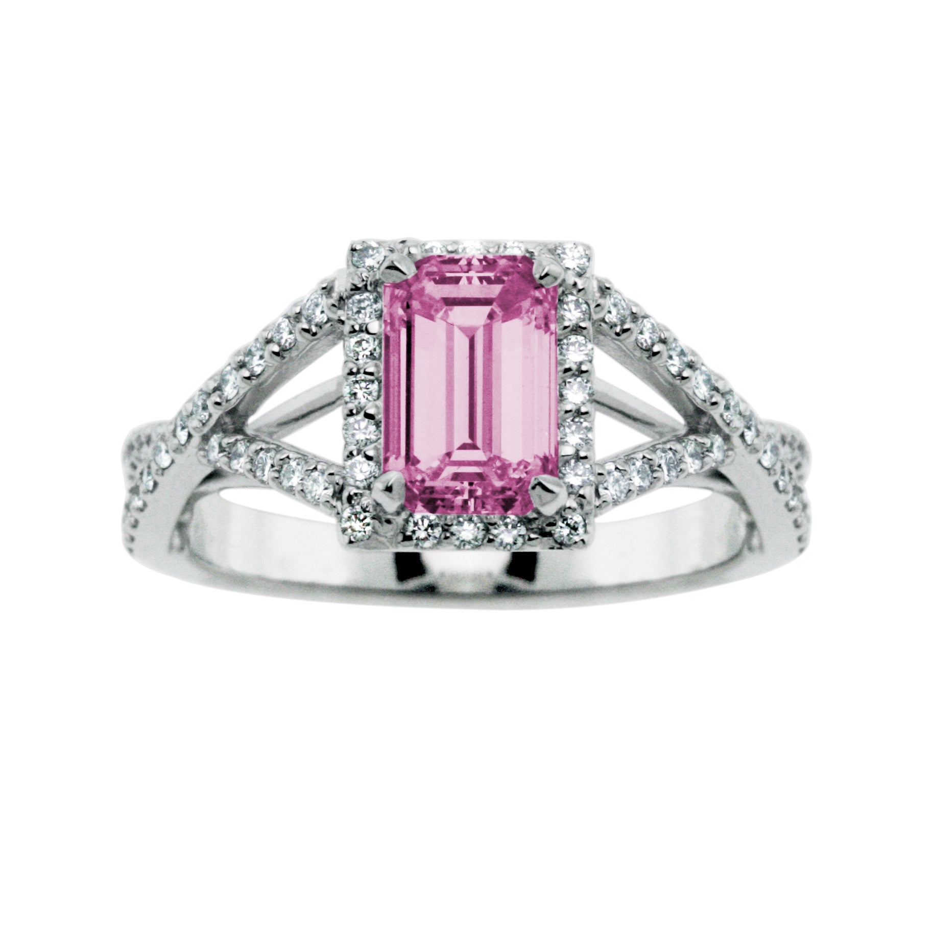 Platinum Ring With 1 Emerald Cut Pink Tourmaline=8x6mm And 66rb Diamonds=1/3 Ctw