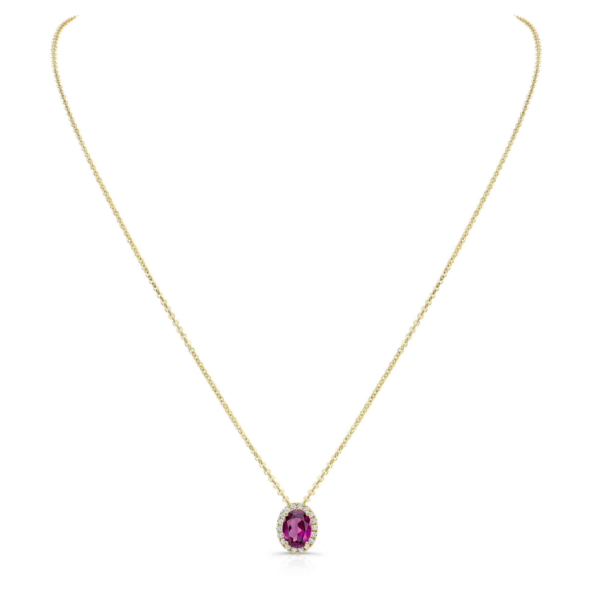 14k Yellow Gold Pendant With 1 Oval Rhodolite Garnet Measuring 8x6mm(1.46ct) And 18 Round Brilliant Diamonds Weighing 0.15 Carats On A 17 Inch Rolo Chain