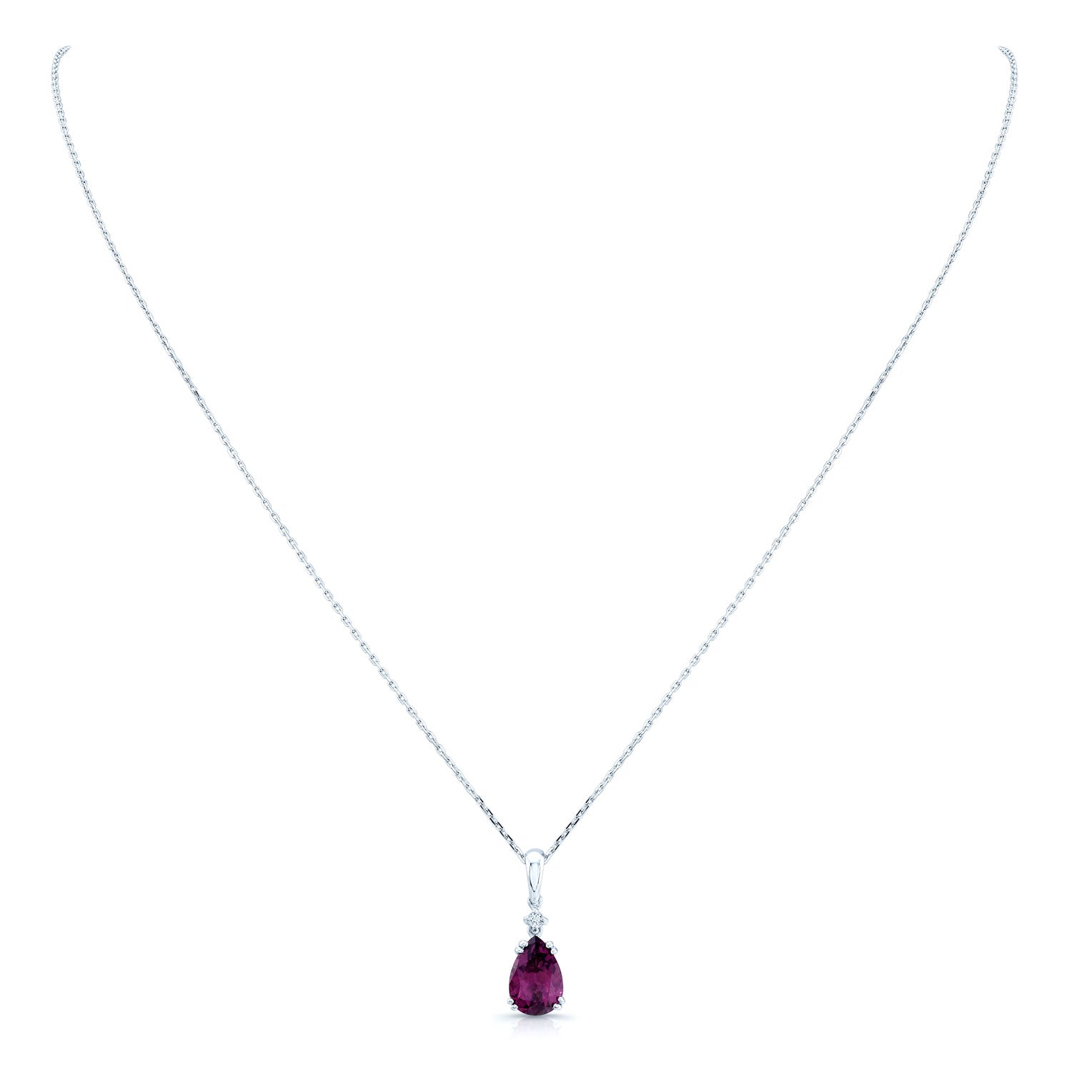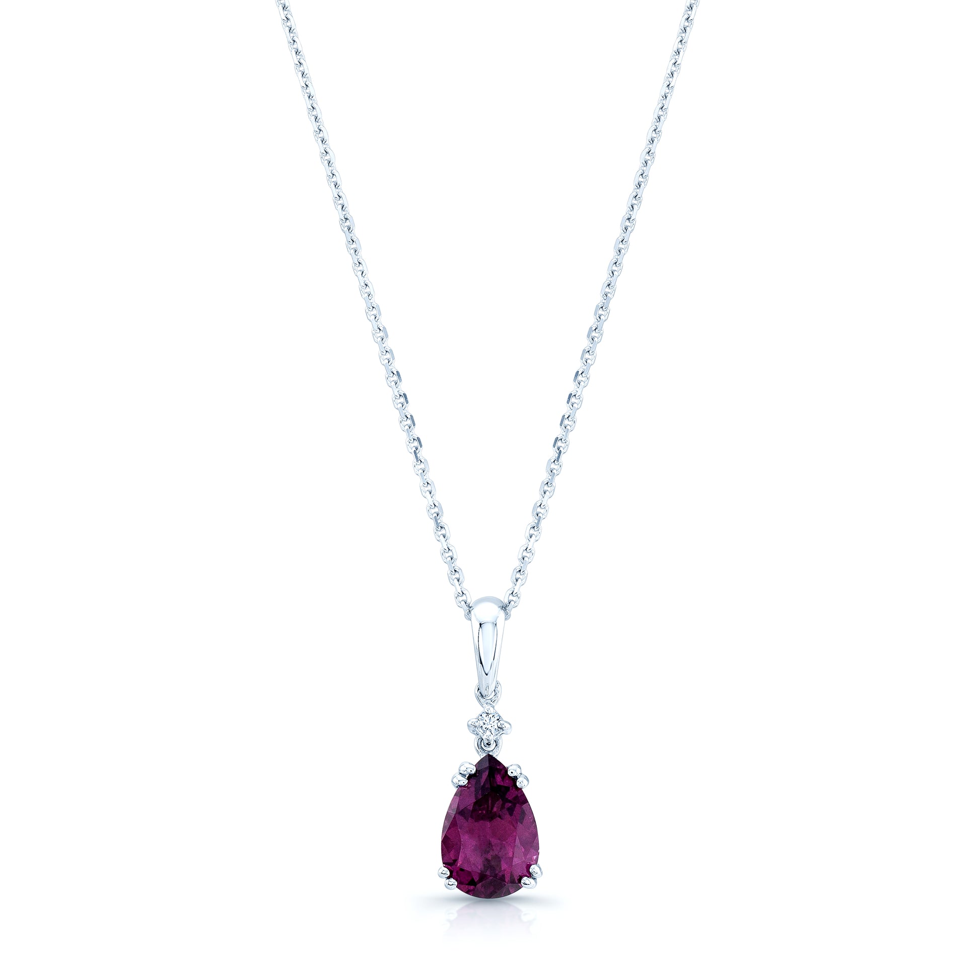 14k White Gold Pendant 1 Pear Shape Rhodolite Garnet 9x6mm, 1 Round Brilliant Diamond Weighing 0.01 Carats With 17 Inch Baby Curb Chain