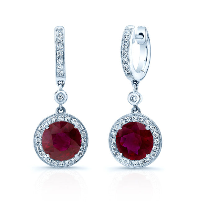 14k White Gold Earrings With 2 7mm Round Rubies And 56 Brilliant Cut Diamonds=1/3 Ctw