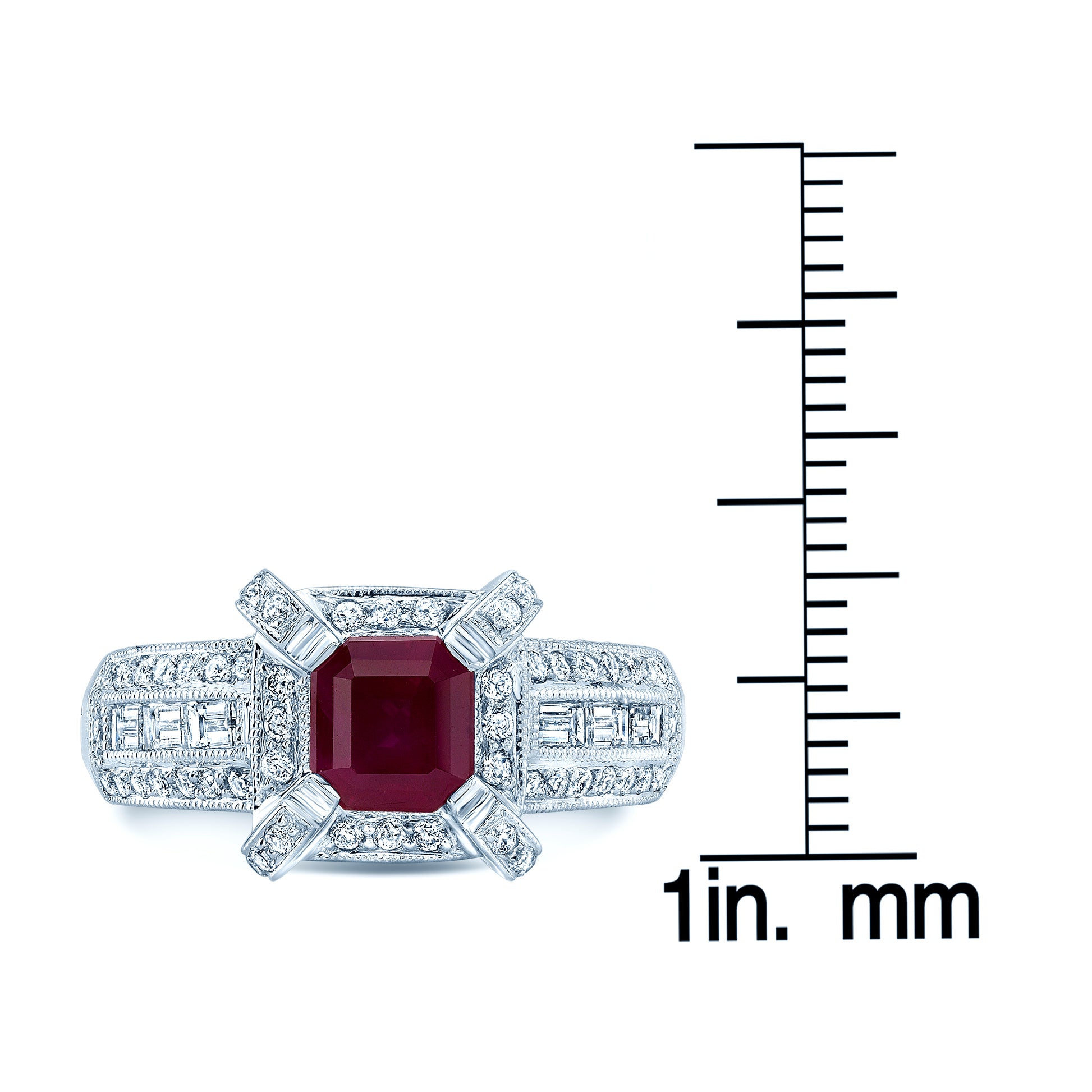 14 Karat White Gold Ring With 1 Emerald Cut Ruby 6.5mm, 114 Round Brilliant Diamonds 0.70ctw, And 6 Baguettes 0.25ctw