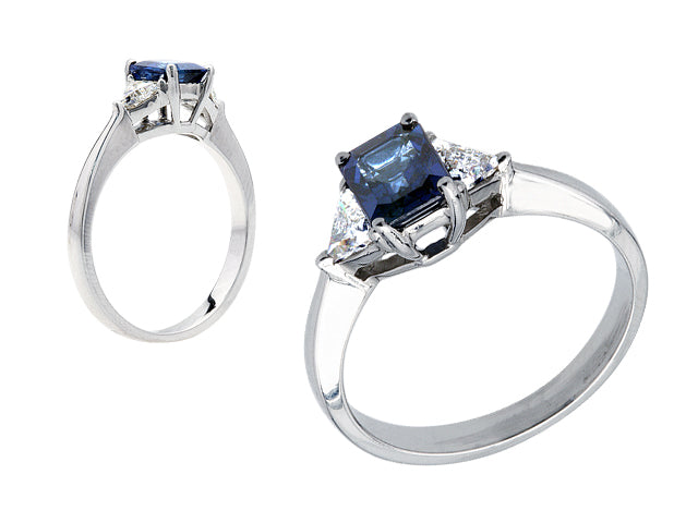 Platinum Ring With 1 Emerald Cut Sapphire 7x5mm And 2 Trillion Cut Diamonds 0.33ctw