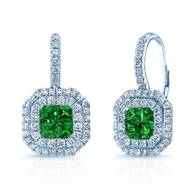 18k White Gold Earrings With 8 Princess Cut Tsavorite Gemstones And 102 Brilliant Cut Diamonds Weighing 2/3 Ctw
