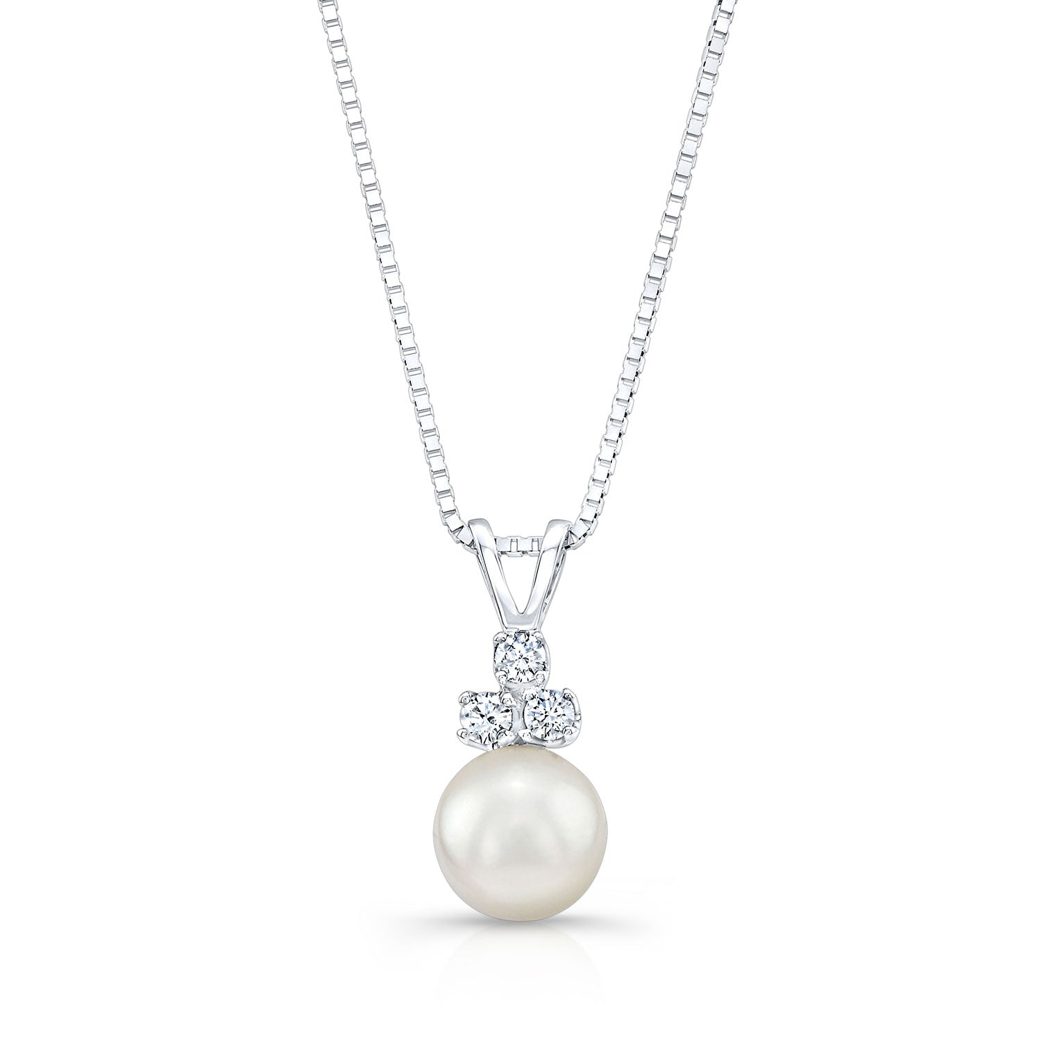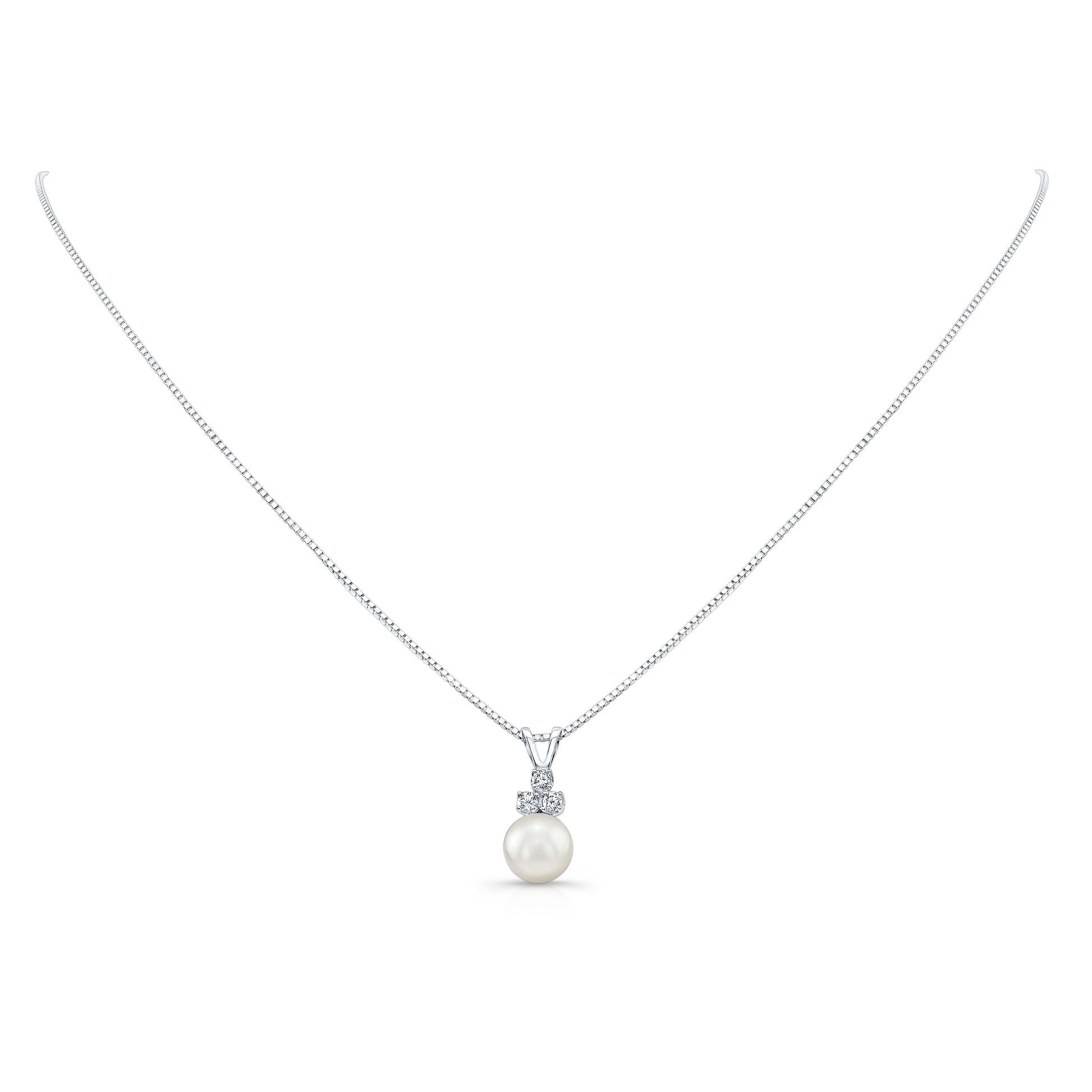 14 Karat White Gold Pendant With 1 Round White Cultured Akoya Pearl And 3 Round Brilliant Diamonds Weighing 0.13 Carats (hi/vs)